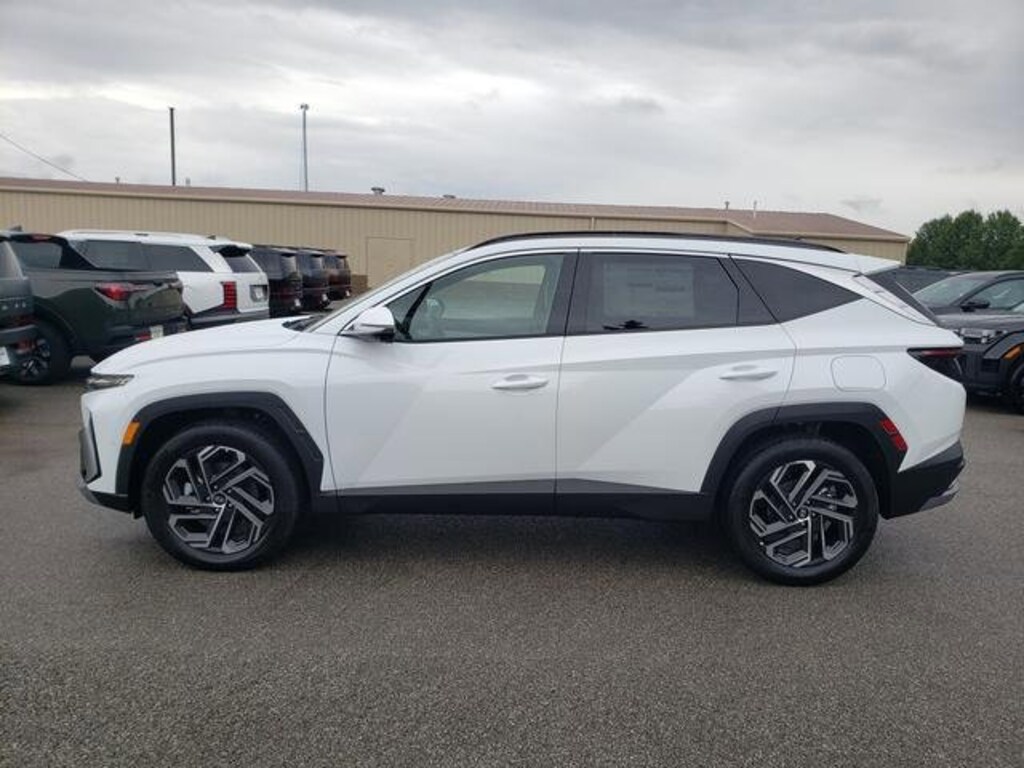 Check out all these great options Option Group 01, 19" Alloy Wheels, 4-Wheel Disc Brakes, 8 Speakers, ABS brakes, Air Conditioning, All Season Fitted Liners, Alloy wheels, AM/FM radio: SiriusXM, Apple CarPlay & Android Auto, Auto High-beam Headlights, Auto-dimming Rear-View mirror, Automatic temperature control, Brake assist, Bumpers: body-color, Cargo Net, Cargo Tray, Carpeted Floor Mats, Cross Rails, Delay-off headlights, Driver door bin, Driver vanity mirror, Dual front impact airbags, Dual front side impact airbags, Electronic Stability Control, Emergency communication system: Bluelink+, First Aid Kit, Four wheel independent suspension, Front anti-roll bar, Front Bucket Seats, Front Center Armrest, Front dual zone A/C, Front reading lights, Fully automatic headlights, Garage door transmitter: HomeLink, Heads-Up Display, Heated & Ventilated Front Bucket Seats, Heated door mirrors, Heated front seats, Heated rear seats, Heated steering wheel, Illuminated entry, Leather steering wheel, Leather-Trimmed Seat Trim, Low tire pressure warning, Memory seat, Navigation System, Occupant sensing airbag, Outside temperature display, Overhead airbag, Overhead console, Panic alarm, Passenger door bin, Passenger vanity mirror, Power door mirrors, Power driver seat, Power Liftgate, Power moonroof, Power passenger seat, Power steering, Power windows, Radio data system, Radio: Bose Premium w/AM/FM/HD Audio System, Rain sensing wipers, Rear anti-roll bar, Rear reading lights, Rear seat center armrest, Rear side impact airbag, Rear window defroster, Rear window wiper, Remote keyless entry, Roadside Assistance Kit, Security system, Speed control, Split folding rear seat, Spoiler, Steering wheel mounted audio controls, Tachometer, Telescoping steering wheel, Tilt steering wheel, Traction control, Trip computer, Turn signal indicator mirrors, Variably intermittent wipers, and Ventilated front seats. Creamy White Pearl 2025 Hyundai Tucson Hybrid Limited AWD 6-Speed Automatic 1.6L I4 DGI Hybrid Turbocharged DOHC 16V LEV3-SULEV30