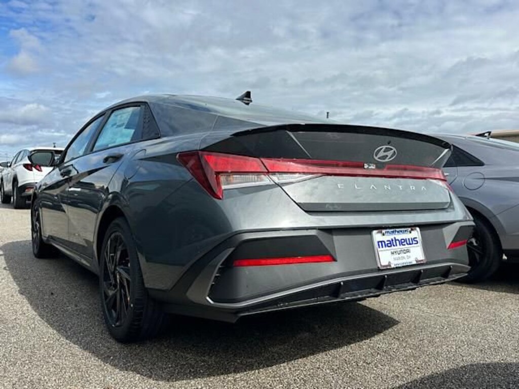 Check out all these great options Option Group 01, 4-Wheel Disc Brakes, 6 Speakers, ABS brakes, Air Conditioning, All-Season Fitted Liners, Alloy wheels, AM/FM radio, Apple CarPlay & Android Auto, Auto High-beam Headlights, Automatic temperature control, Brake assist, Bumpers: body-color, Cargo Tray, Carpeted Floor Mats, Delay-off headlights, Driver door bin, Driver vanity mirror, Dual front impact airbags, Dual front side impact airbags, Electronic Stability Control, Exterior Parking Camera Rear, First Aid Kit, Front anti-roll bar, Front Bucket Seats, Front Center Armrest, Front dual zone A/C, Front reading lights, Front wheel independent suspension, Fully automatic headlights, Illuminated entry, Low tire pressure warning, Occupant sensing airbag, Outside temperature display, Overhead airbag, Overhead console, Panic alarm, Passenger door bin, Passenger vanity mirror, Power door mirrors, Power steering, Power windows, Premium Cloth Seat Trim, Radio: AM/FM/HD Display Audio, Rear side impact airbag, Rear window defroster, Remote keyless entry, Security system, Speed control, Speed-sensing steering, Spoiler, Steering wheel mounted audio controls, Tachometer, Telescoping steering wheel, Tilt steering wheel, Traction control, Trip computer, Variably intermittent wipers, and Wheels: 17" x 7.0J Alloy Gloss Black w/Dark Finish. Ecotronic Gray 2026 Hyundai Elantra SEL Sport FWD CVT I4