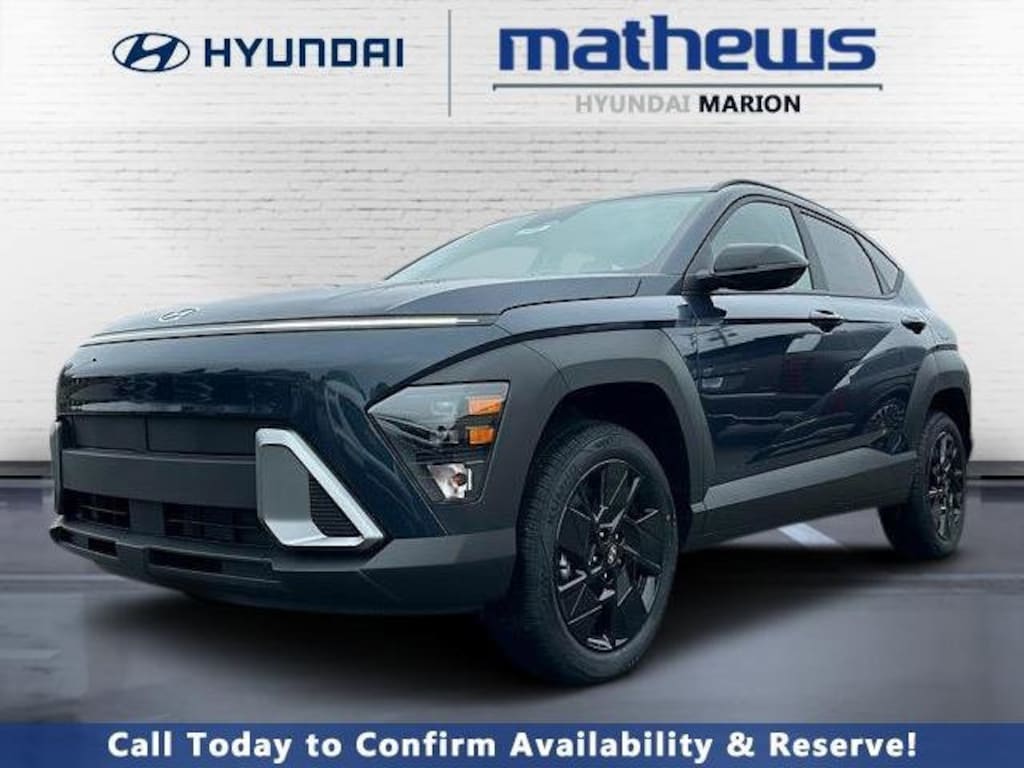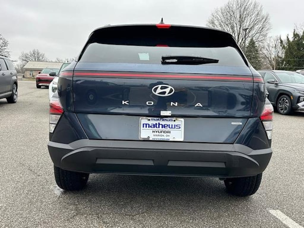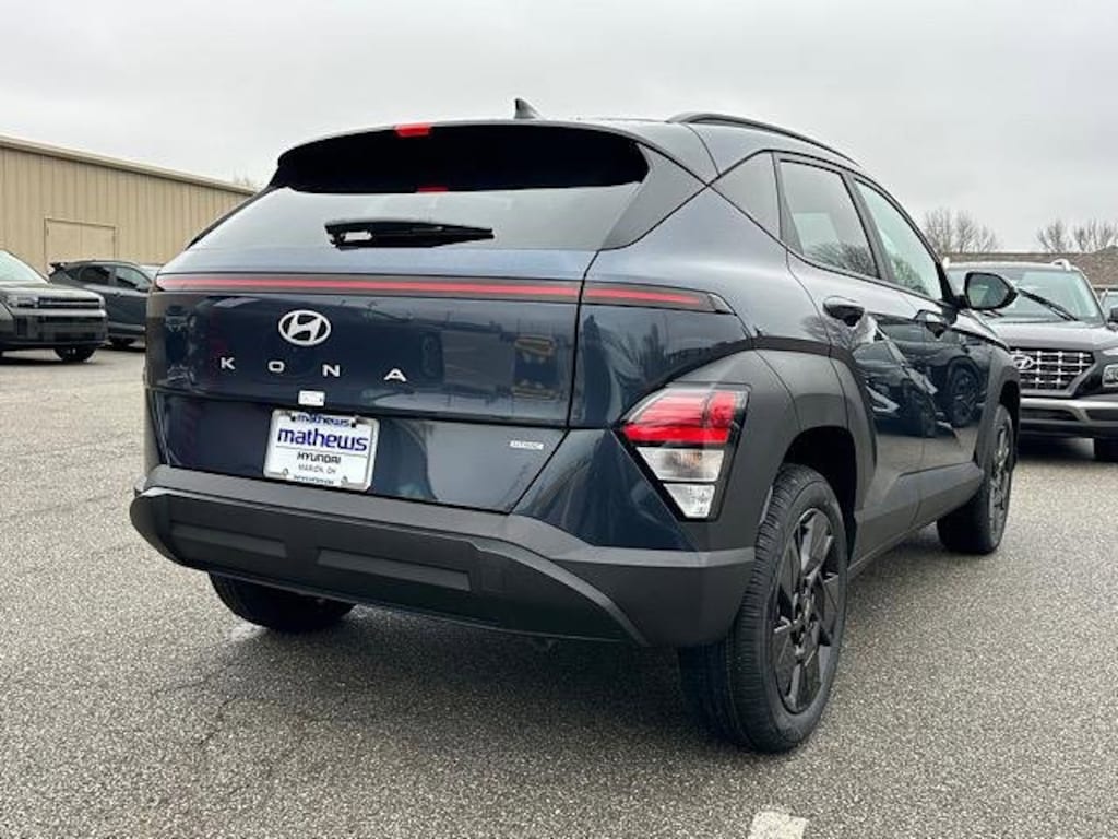 Check out all these great options Option Group 01, 4-Wheel Disc Brakes, 6 Speakers, ABS brakes, Air Conditioning, Alloy wheels, AM/FM radio: SiriusXM, Apple CarPlay & Android Auto, Auto High-beam Headlights, Automatic temperature control, Brake assist, Bumpers: body-color, Cargo Net, Carpeted Floor Mats, Cloth Seat Trim, Cross Rails, Delay-off headlights, Driver door bin, Driver vanity mirror, Dual front impact airbags, Dual front side impact airbags, Electronic Stability Control, Emergency communication system: None, Exterior Parking Camera Rear, First Aid Kit, Four wheel independent suspension, Front anti-roll bar, Front Bucket Seats, Front Center Armrest, Front dual zone A/C, Front reading lights, Fully automatic headlights, Heated door mirrors, Heated Front Bucket Seats, Heated front seats, Illuminated entry, Leather steering wheel, Low tire pressure warning, Occupant sensing airbag, Outside temperature display, Overhead airbag, Panic alarm, Passenger door bin, Passenger vanity mirror, Power door mirrors, Power steering, Power windows, Radio: AM/FM/SiriusXM/HD Audio System, Rear anti-roll bar, Rear seat center armrest, Rear window defroster, Rear window wiper, Remote keyless entry, Security system, Speed control, Speed-sensing steering, Split folding rear seat, Spoiler, Steering wheel mounted audio controls, Tachometer, Telescoping steering wheel, Tilt steering wheel, Traction control, Trip computer, Variably intermittent wipers, and Wheels: 18" x 7.0J Black Alloy. Denim Blue Pearl 2026 Hyundai Kona SEL Sport AWD CVT 2.0L I4 DOHC 16V