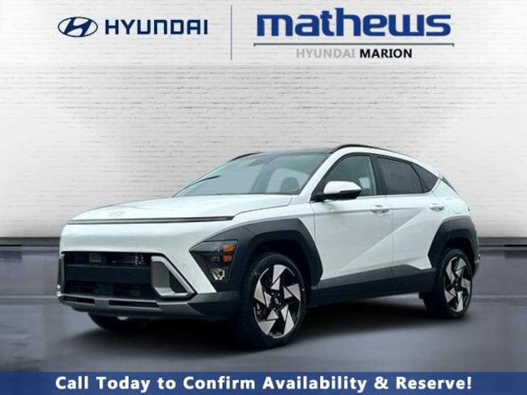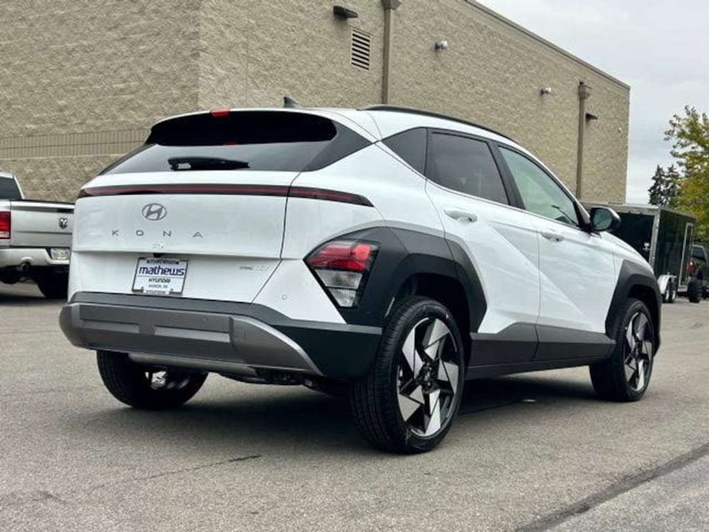 Check out all these great options Option Group 01, 4-Wheel Disc Brakes, 8 Speakers, ABS brakes, Air Conditioning, Alloy wheels, AM/FM radio: SiriusXM, Apple CarPlay & Android Auto, Auto High-beam Headlights, Auto-dimming Rear-View mirror, Automatic temperature control, Brake assist, Bumpers: body-color, Cargo Blocks, Cargo Net, Carpeted Floor Mats, Cross Rails, Delay-off headlights, Driver door bin, Driver vanity mirror, Dual front impact airbags, Dual front side impact airbags, Electronic Stability Control, Emergency communication system: Bluelink+, Four wheel independent suspension, Front anti-roll bar, Front Bucket Seats, Front Center Armrest, Front dual zone A/C, Front reading lights, Fully automatic headlights, H-Tex Seat Trim, Heated & Ventilated Front Bucket Seats, Heated door mirrors, Heated front seats, Heated steering wheel, Illuminated entry, Leather steering wheel, Low tire pressure warning, Navigation System, Occupant sensing airbag, Outside temperature display, Overhead airbag, Panic alarm, Passenger door bin, Passenger vanity mirror, Power door mirrors, Power driver seat, Power Liftgate, Power moonroof, Power steering, Power windows, Radio: AM/FM/SiriusXM/HD Radio Audio System, Rear anti-roll bar, Rear seat center armrest, Rear window defroster, Rear window wiper, Remote keyless entry, Road Assistance Kit, Security system, Speed control, Speed-sensing steering, Split folding rear seat, Spoiler, Steering wheel mounted audio controls, Tachometer, Telescoping steering wheel, Tilt steering wheel, Traction control, Trip computer, Turn signal indicator mirrors, Variably intermittent wipers, Ventilated front seats, and Wheels: 19" x 7.5J Silver/Black Alloy. Atlas White 2026 Hyundai Kona Limited AWD 8-Speed Automatic I4